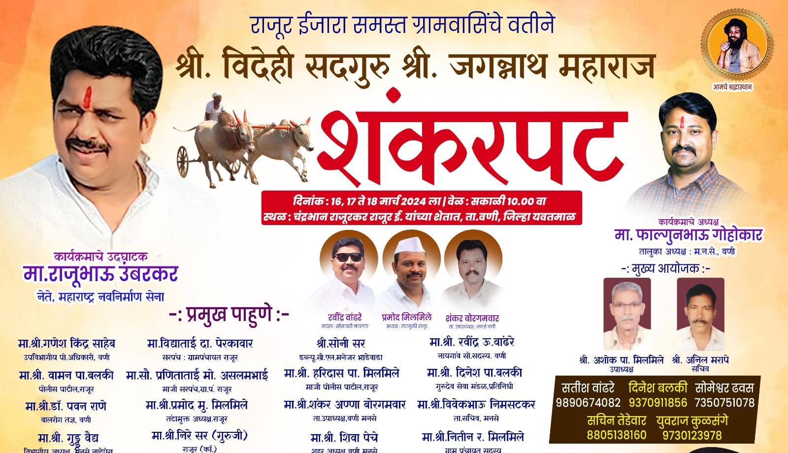 राजूर इजारा ग्रामस्थ वासियांच्या वतीने आयोजित श्री. विदेही सद्गुरू, श्री. जगन्नाथ महाराज शंकरपटात सहभागी होण्यासाठी राज्यातील कानाकोपऱ्यातून बैलजोड्या वणी तालुक्यातील राजूर येथे दाखल होत आहे. या‎ ठिकाणी परिसरासह राज्यातील‎ पट प्रेमींना शंकर पटाची मेजवाणी‎ मिळणार असून विविध‎ ठिकाणावरून आलेल्या सर्जा-‎ राजाच्या जोड्या आपली कसब‎ दाखविण्यासाठी सज्ज झालेले‎ आहे.‎ तर विजेत्या बैलजोड्या स्पर्धकांना लाखोंच्या बक्षिसाची मेजवानी मिळणार आहे. तरी या बैलगाडा शर्यतीत जास्तीत जास्त बैलगाडा मालक, चालक व बैलगाडा प्रेमीनी सहभागी व्हावे असे आवाहन आयोजक समितीचे अध्यक्ष सोमेंश्वर ढवस, अशोक मिलमिले, अनिल मरापे, सतीश वांढरे, दिनेश बलकी, सचिन तेडेवार, युवराज कुळसंगे यांच्या सह सर्व सदस्यांच्या वतीने करण्यात येतं आहे..