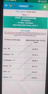 चंद्रपूर, वणी , आर्णी लोकसभा क्षेत्रात पाच वाजेपर्यंत मतदानाच्या 55.11 % मतदान झाले होते.
