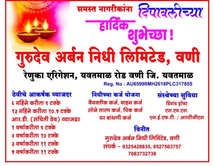 Breaking News गुरुदेव अर्बन निधी लिमिटेड वणी कडून दीपावलीच्या हार्दिक शुभेच्छा By Raju Turankar - November 4, 2024 0 55 Share WhatsAppFacebookTwitter गुरुदेव निधी अर्बन लिमिटेड वणी च्या सर्व सभासदांना, कर्जदारांना ठेवीदारांना व हितचिंतकांना दीपावलीच्या हार्दिक शुभेच्छा….