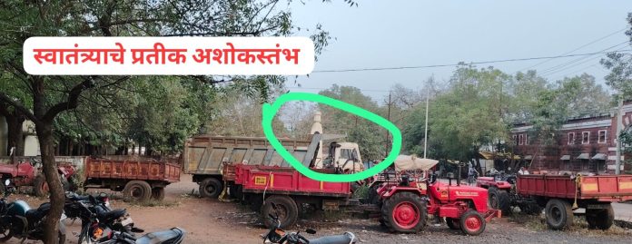 महसूल विभागाचा, तहसील परिसरात जप्त गाड्यांचा भंगार, स्वातंत्र्याचे प्रतिक आसलेल्या अशोक स्तंभाचा श्वास गुदमरतो.