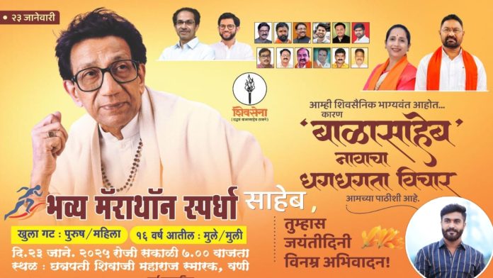 शिवसेना पक्षप्रमुख बाळासाहेब ठाकरे यांच्या जयंतीनिमित्त निमित्ताने आमदार संजय देरकर यांच्या मार्गदर्शनात युवासेना उपजिल्हा प्रमुख अजिंक्य शेंडे यांच्या वतीने छत्रपति शिवाजी महाराज चौक वणी येथे २३ जानेवारी रोजी सकाळी ७ वाजता भव्य मॅराथॉन स्पर्धेचे आयोजन करण्यात आले आहे.