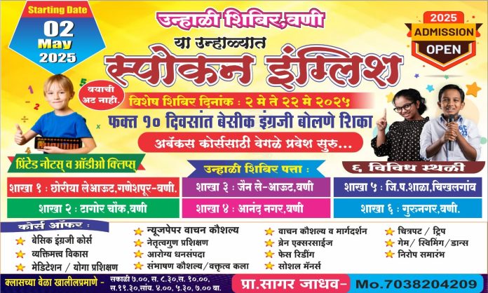 वणीः आजच्या काळात इंग्रजी अनेकांना चांगलं वाचता आणि लिहिता येतं. तरीदेखील इंग्रजीतून संवाद साधणं अनेकांना जमत नाही. त्याचा तसा अनेकांना सराव नसतो किंवा तसं वातावरण मिळत नाही. त्यातही नोकरदार, गृहिणी आणि विद्यार्थ्यांना वेळ मिळत नाही. म्हणूनच स्पोकन इंग्लिश म्हणजे इंग्रजी संभाषणाचे विशेष शिबिर आयोजित करण्यात आले आहे. इयत्ता 3 री ते पोस्ट ग्रॅज्युएटपर्यंतचे सर्व विद्याथी, स्पर्धा परीक्षांची तयारी करणारे, गृहिणी, विद्यार्थी, विद्यार्थीनी, व्यावसायिक आणि नोकरदारांसाठी हे शिबिर अत्यंत सोयीचे आहे. हे शिबिर शहरातील, जनता शाळेजवळील, गुरूनगर येथील, हनुमानमंदिर जवळ, टागोर चौकातील के.बी.सी. हाईट्स बिल्डिंग, नवीन महाराष्ट्र