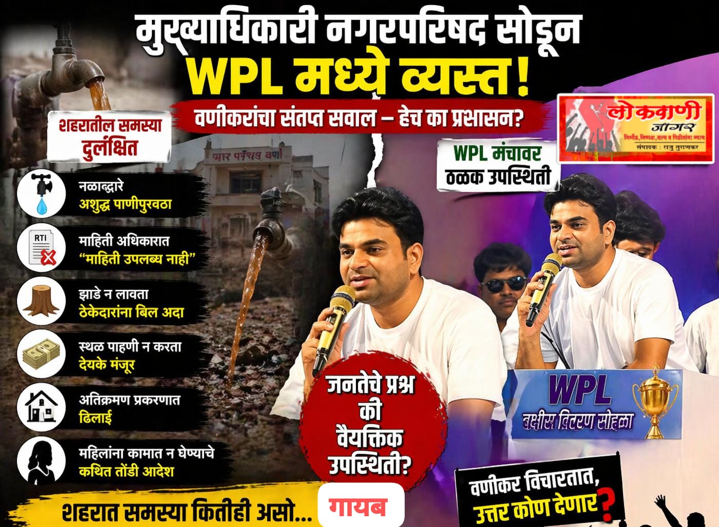 वणी शहरात सध्या संतापाची लाट उसळली आहे. नगरपरिषदेचे मुख्याधिकारी शहरातील मूलभूत प्रश्नांकडे दुर्लक्ष करत असताना, WANI Premier League (WPL) च्या मंचावर मात्र ठळक उपस्थिती लावताना दिसल्याने नागरिकांमध्ये तीव्र नाराजी व्यक्त होत आहे.