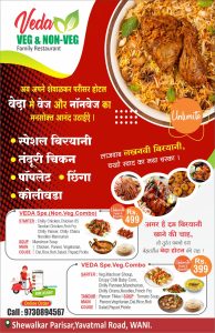 आता जनतेच्या सेवेत वेदा रेस्टॉरंट १७ डिसेंबर पासून राम शेवाळकर परिसरात मांसाहारी व शाकाहारी जेवणाचा संगम (कॉम्बो) घेऊन येत आहे. यामध्ये वेज थाळी, चिकन, मटण थाळी, फिश थाळी, अनलिमिटेड जेवणाचा स्वाद केवळ 499 रुपयात , तर चला मग वेदा रेस्टॉरंट वणी येथे जेवणाचा मनमुराद आनंद लुटुया...