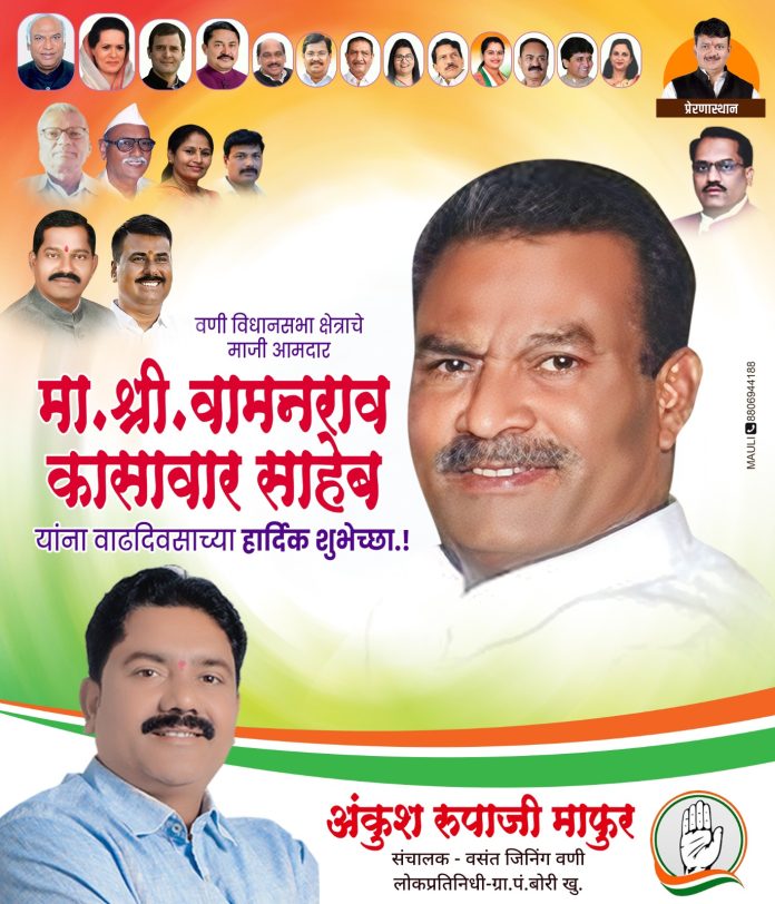 श्री अंकुश माफुर संचालक दि.वसंत जिनिग अँड प्रेसिंग फॅक्टरी वणी, ग्राम पंचायत सदस्य बोरी तथा सारोदी समाज संघटना विदर्भ सचिव द्वारा माजी आमदार वामनराव कासावार यांना वाढदिवसाच्या निमित्ताने सुदृढ आरोग्यासाठी व भावी राजकीय वाटचाली साठी मंगलमय हार्दिक शुभेच्छा.