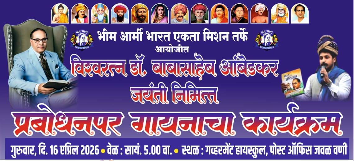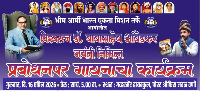 भारतरत्न डॉ. बाबासाहेब आंबेडकर यांच्या जयंतीनिमित्त वणी येथे भीम आर्मी भारत एकता मिशन तर्फे प्रबोधनपर भीम गीतांचा भव्य कार्यक्रम आयोजित करण्यात आला आहे. गुरुवार, दि. १६ एप्रिल २०२६ रोजी सायंकाळी ५ वाजता गव्हर्नमेंट हायस्कूल, पोस्ट ऑफिसजवळ, वणी येथे हा कार्यक्रम रंगणार आहे.