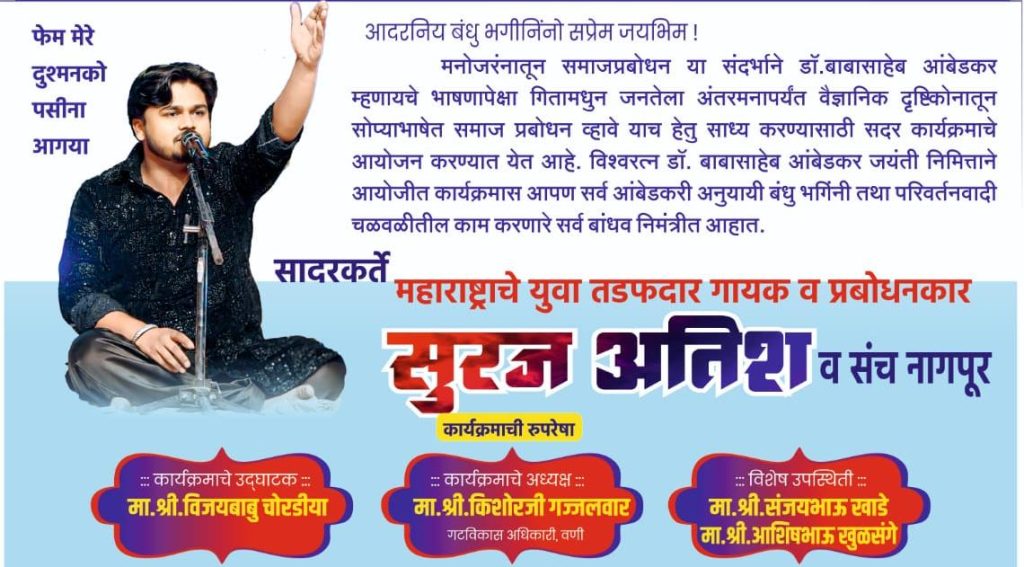 सुरज अतिश यांच्या गीतांनी वणीत रंगणार प्रबोधनाचा मेळावा.